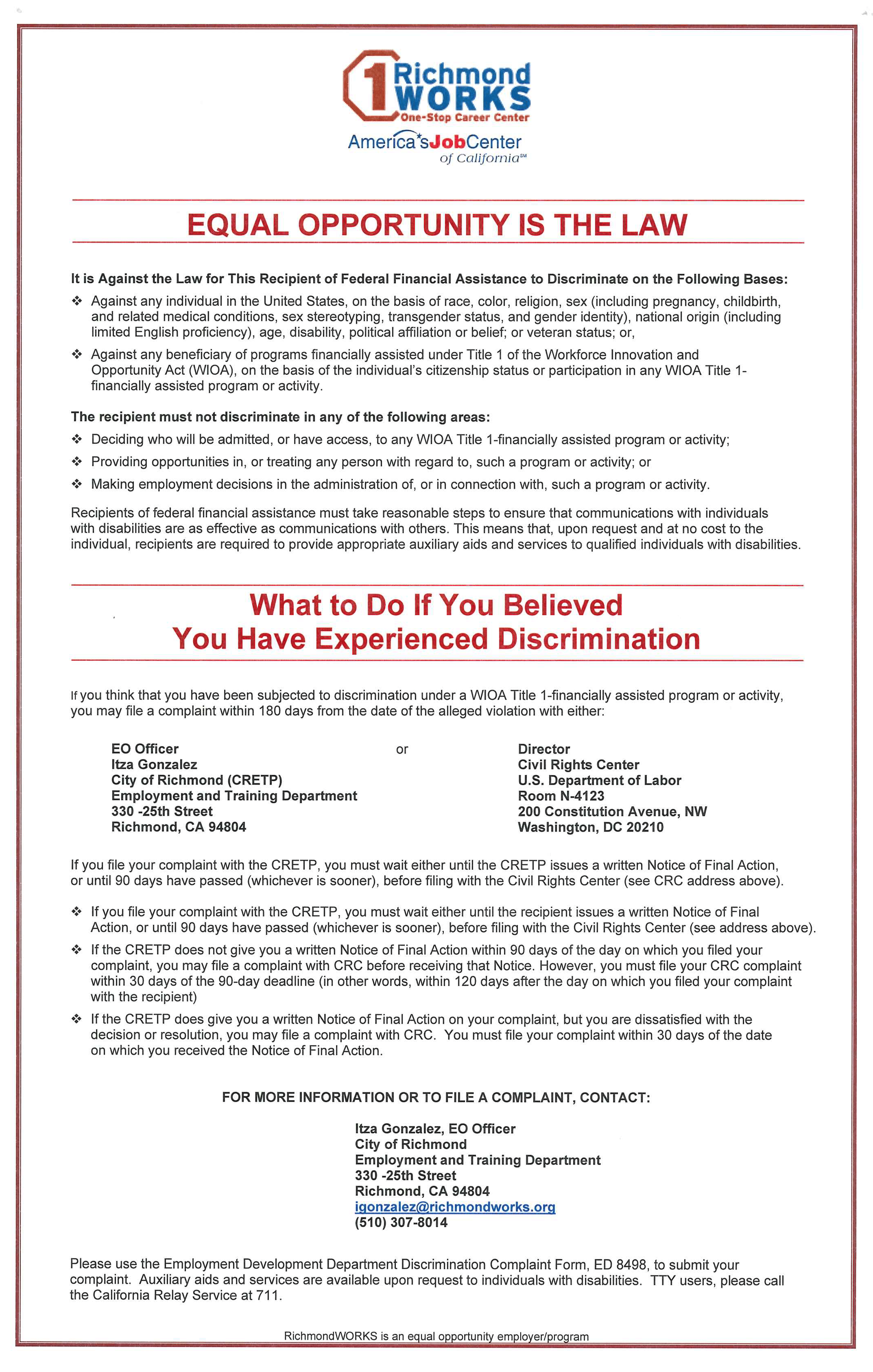 If you think that you have been subjected to discrimination under a WIAO Title 1 -financially assisted program or activity, you may file a complaint within 180 days from the date alleged violation with either:EO Officer